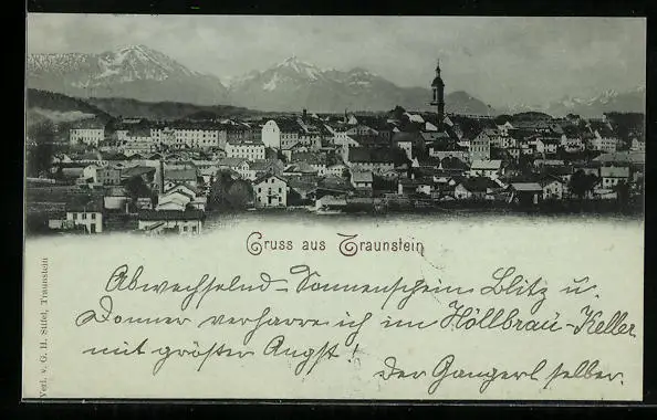 Mondschein-AK Traunstein, Ortspanorama mit Bergkette