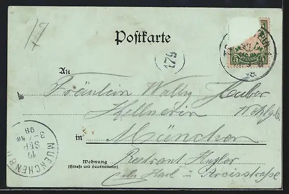 alte Ansichtskarte, gelaufen 1898, Briefmarke entfernt, rückseitig Oberflächenschaden, Stempelspur, guter Zustand
