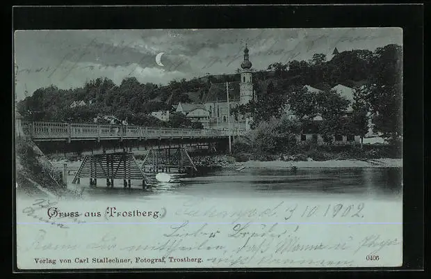 Mondschein-AK Trostberg, Uferpartie mit Kirche und Brücke