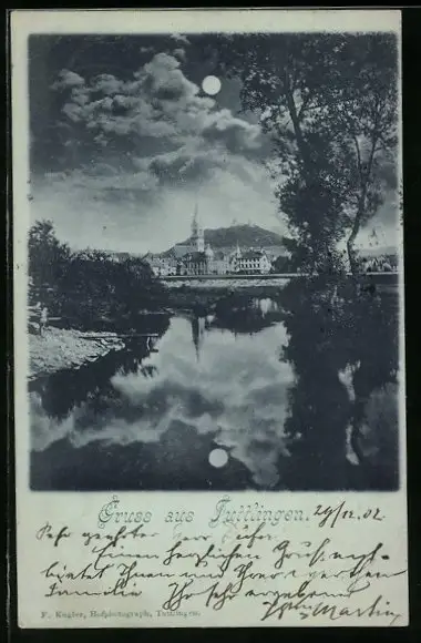 Mondschein-AK Tuttlingen, Panorama mit Kirche