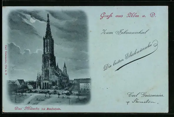 Mondschein-AK Ulm a. D., Das Münster bei Vollmond