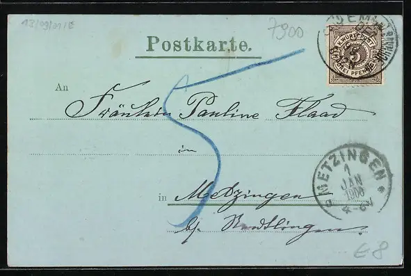 Personenbezogene Daten auf der Rückseite der Karte wurden durch blauen Textmarker unkenntlich gemacht. Die blauen Stellen sind auf die Vorderseite durchgeweicht und wirken sich negativ auf das Postkartenfoto aus