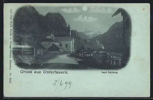 Mondschein-AK Untertauern, Strassenpartie mit Kirche