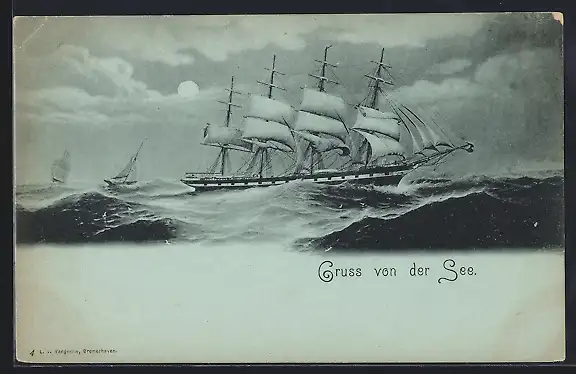 Mondschein-AK Viermaster Segelschiff im Sturm