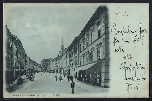 Mondschein-AK Villach, Platz mit Geschäften
