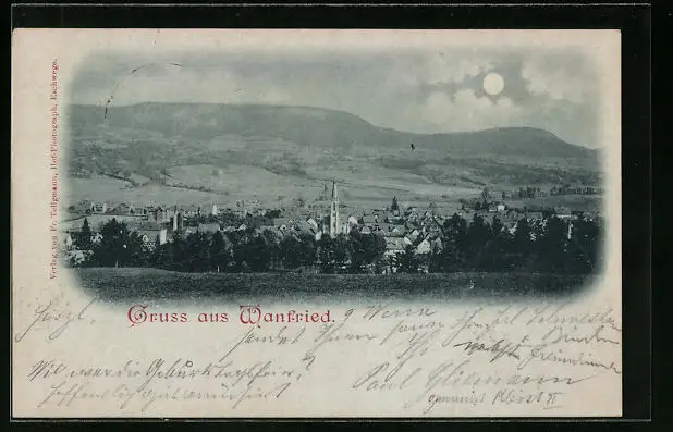 Mondschein-AK Wanfried, Panorama mit Kirche