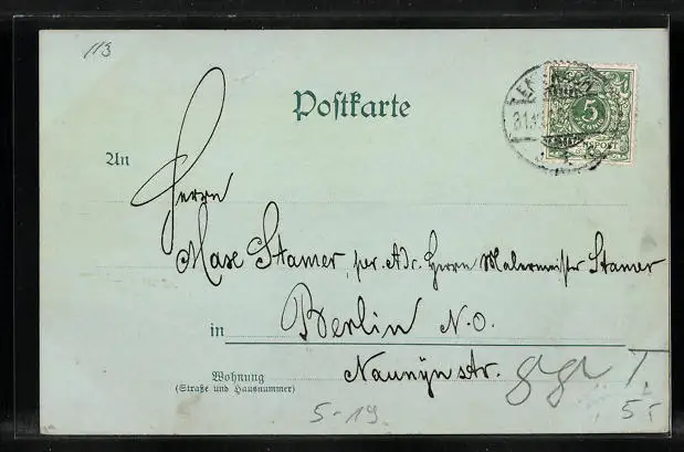 Personenbezogene Daten auf der Rückseite der Karte wurden durch blauen Textmarker unkenntlich gemacht. Die blauen Stellen sind auf die Vorderseite durchgeweicht und wirken sich negativ auf das Postkartenfoto aus