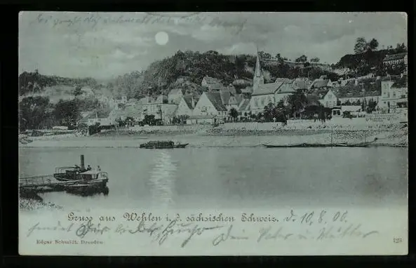 Mondschein-AK Wehlen /Sächs. Schweiz, Ortsansicht im Vollmondlicht