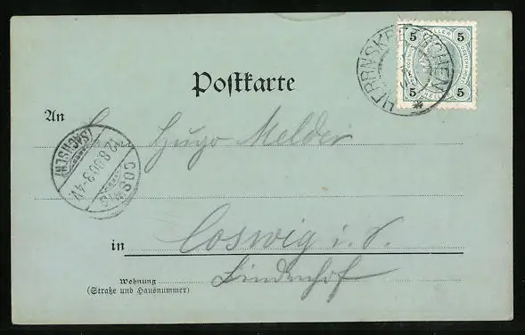 Personenbezogene Daten auf der Rückseite der Karte wurden durch blauen Textmarker unkenntlich gemacht. Die blauen Stellen sind auf die Vorderseite durchgeweicht und wirken sich negativ auf das Postkartenfoto aus