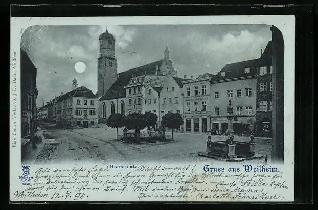Mondschein-AK Weilheim, Hauptplatz im Vollmondlicht