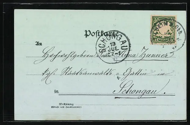 Personenbezogene Daten auf der Rückseite der Karte wurden durch blauen Textmarker unkenntlich gemacht. Die blauen Stellen sind auf die Vorderseite durchgeweicht und wirken sich negativ auf das Postkartenfoto aus