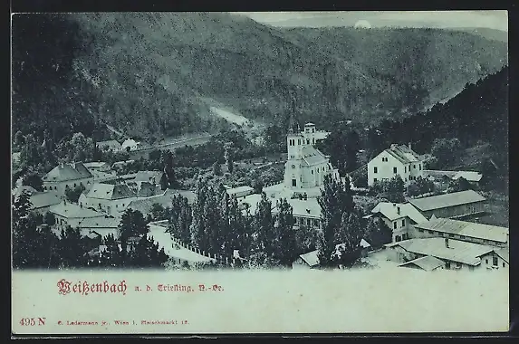 Mondschein-AK Weissenbach a. d. Triesting, Ortsansicht mit zentraler Kirche