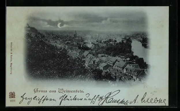 Mondschein-AK Weissenfels, Ortsansicht mit Fluss