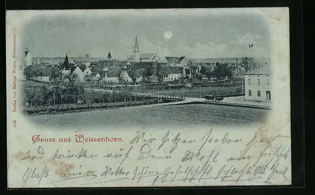 Mondschein-AK Weissenhorn, Ortsansicht mit Kirche