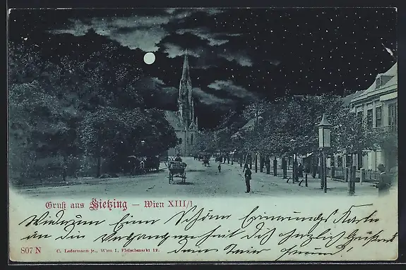 Mondschein-AK Wien, Hietzing, Strassenpartie mit Blick zur Kirche