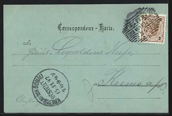 alte Ansichtskarte, gelaufen 1897, Eckknick oben re., guter Zustand