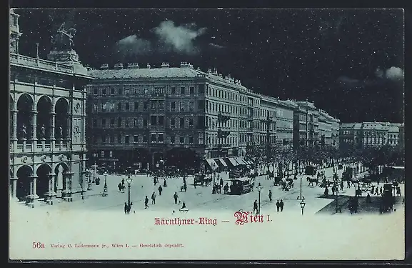 Mondschein-AK Wien, Strasse Kärnthner-Ring mit Strassenbahn bei Nacht
