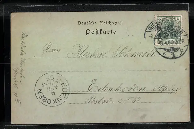 Personenbezogene Daten auf der Rückseite der Karte wurden durch blauen Textmarker unkenntlich gemacht. Die blauen Stellen sind auf die Vorderseite durchgeweicht und wirken sich negativ auf das Postkartenfoto aus