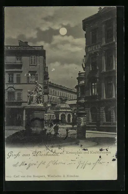 Mondschein-AK Wiesbaden, Kranzplatz und Kochbrunnen
