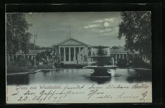 Mondschein-AK Wiesbaden, Kurhaus mit Springbrunnen