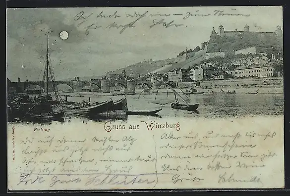 Mondschein-AK Würzburg, Flusspartie mit der Festung