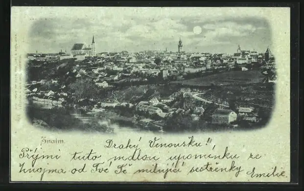 Mondschein-AK Znaim, Ortspartie im Mondlicht