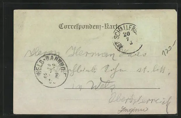 Personenbezogene Daten auf der Rückseite der Karte wurden durch blauen Textmarker unkenntlich gemacht. Die blauen Stellen sind auf die Vorderseite durchgeweicht und wirken sich negativ auf das Postkartenfoto aus