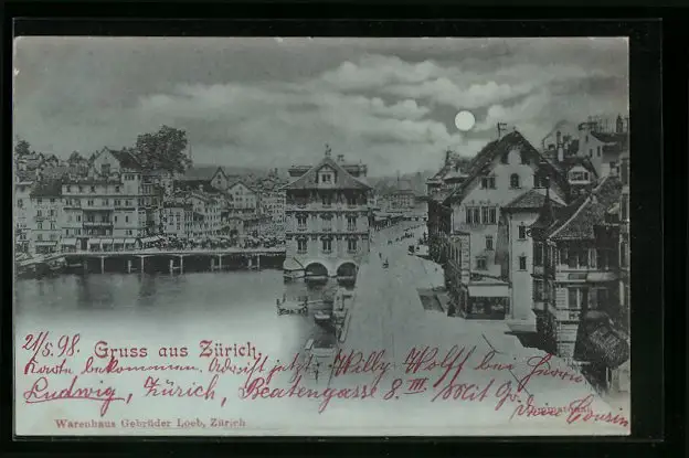 Mondschein-AK Zürich, Limmatquai im Mondlicht