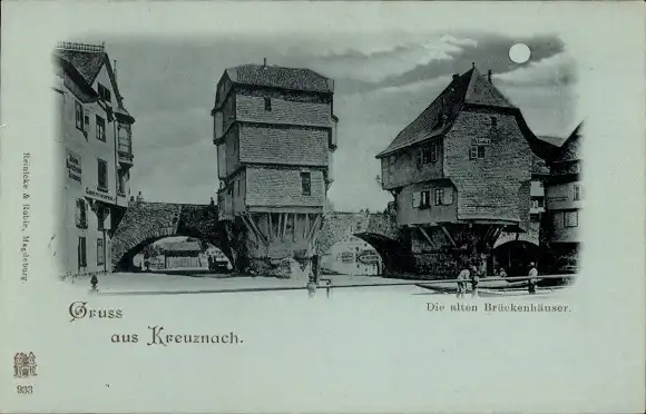 Mondschein Ak Bad Kreuznach an der Nahe, alte Brückenhäuser