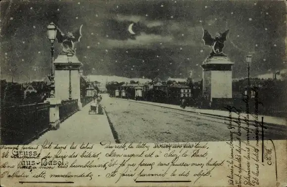 Mondschein Ak Basel Bâle Stadt Schweiz, Wettsteinbrücke bei Nacht