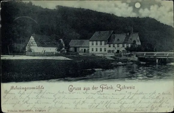 Mondschein Ak Behringersmühle Gößweinstein in Oberfranken, Blick auf den Ort, Brücke, Häuser