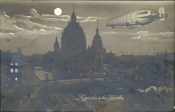 Mondschein Ak Berlin Mitte, Zeppelin über der Stadt, Dom