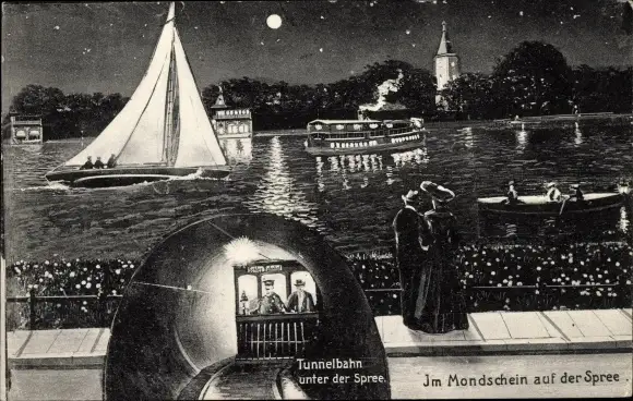 Mondschein Ak Berlin, Spree im Mondschein, Segelboot, Tunnelbahn unter der Spree