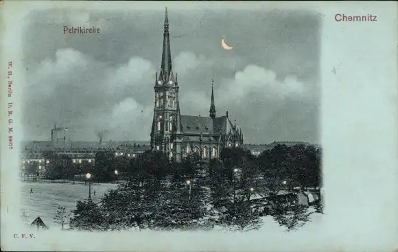 Mondschein Ak Chemnitz in Sachsen, Petrikirche