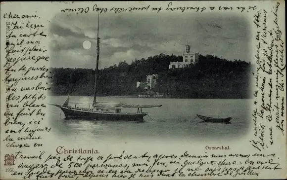 Mondschein Ak Christiania Oslo Norwegen, Oscarshal, Segelboot