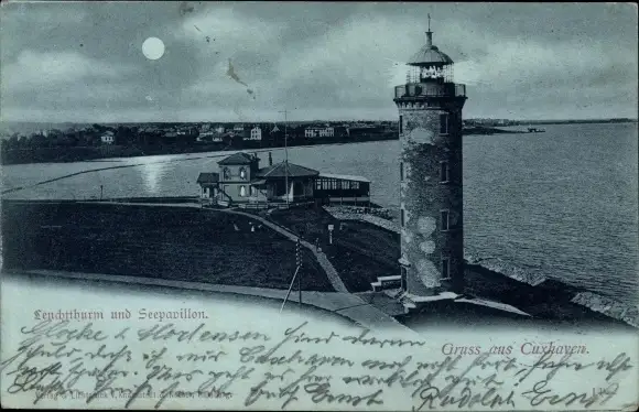 Mondschein Ak Cuxhaven, Leuchtturm, Seepavillon