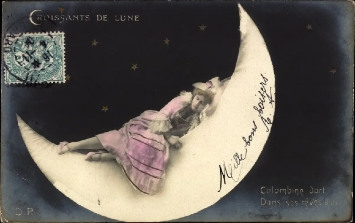 Mondschein Ak Frau auf dem Mond schlafend, Kleid, Hut