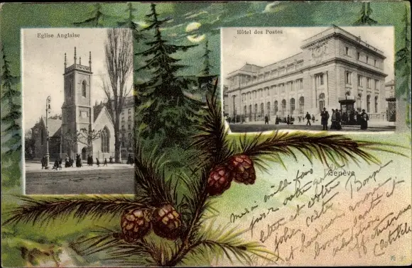 Mondschein Ak Genève Genf Schweiz, Eglise Anglaise, Hotel des Postes, Tannenbäume, Zapfen