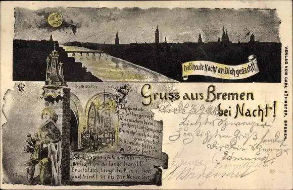 Mondschein Ak Hansestadt Bremen, Stadtsilhouette, Ratskeller