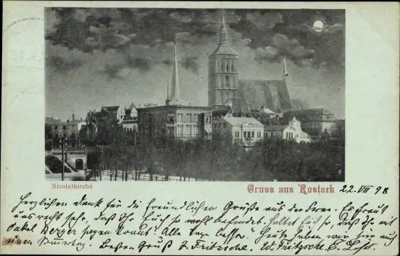 Mondschein Ak Hansestadt Rostock, Nicolaikirche bei Nacht
