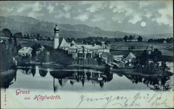Mondschein Ak Höglwörth Anger im Rupertiwinkel Oberbayern, Blick auf den Ort, Kirche