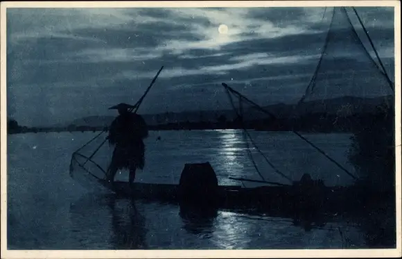 Mondschein Ak Japan, Fischer, Fischernetz, Boot