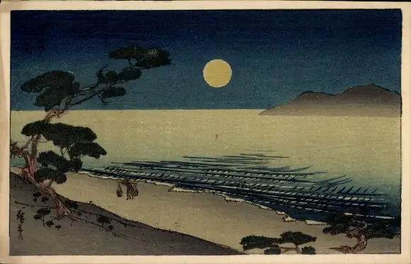 Mondschein Ak Japan, Meer, Ufer, Bäume, Strand