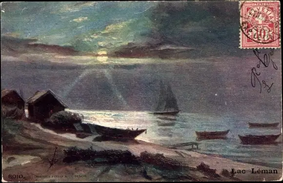 Mondschein Ak Lac Léman Kt Waadt Schweiz, Partie am Ufer, Ruderboote