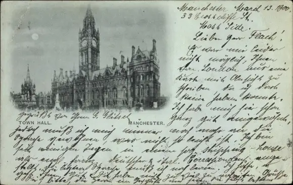 Mondschein Ak Manchester North West England, Town Hall