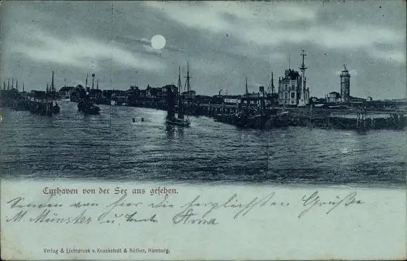 Mondschein Ak Nordseebad Cuxhaven, Von der See aus gesehen