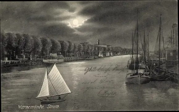 Mondschein Ak Ostseebad Warnemünde Rostock, Am Strom