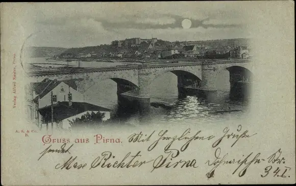 Mondschein Ak Pirna an der Elbe, Gesamtansicht, Brücke