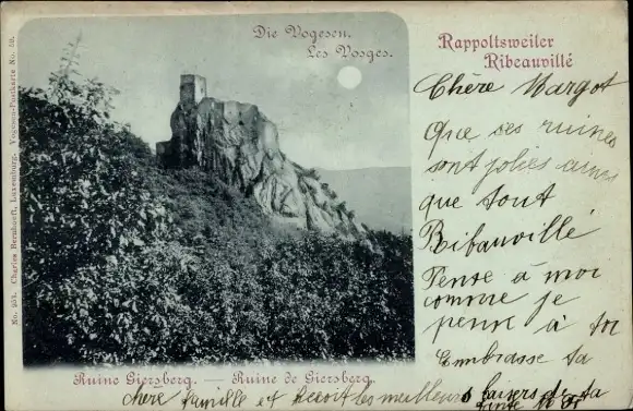 Mondschein Ak Ribeauvillé Rappoltsweiler Elsass Haut Rhin, Burg Girsberg, Ruine