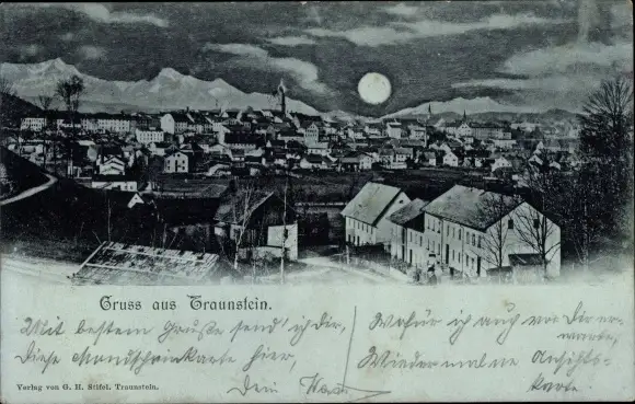 Mondschein Ak Traunstein in Oberbayern, Totalansicht vom Ort